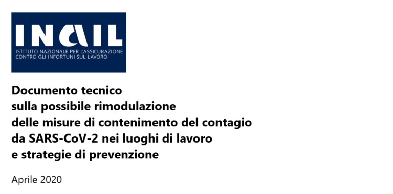 In data 23/04/2020 l’INAIL ha pubblicato un documento tecnico sulla possibile rimodulazione delle misure di contenimento del contagio da SARS-CoV-2 nei luoghi di lavoro e strategie di prevenzione.